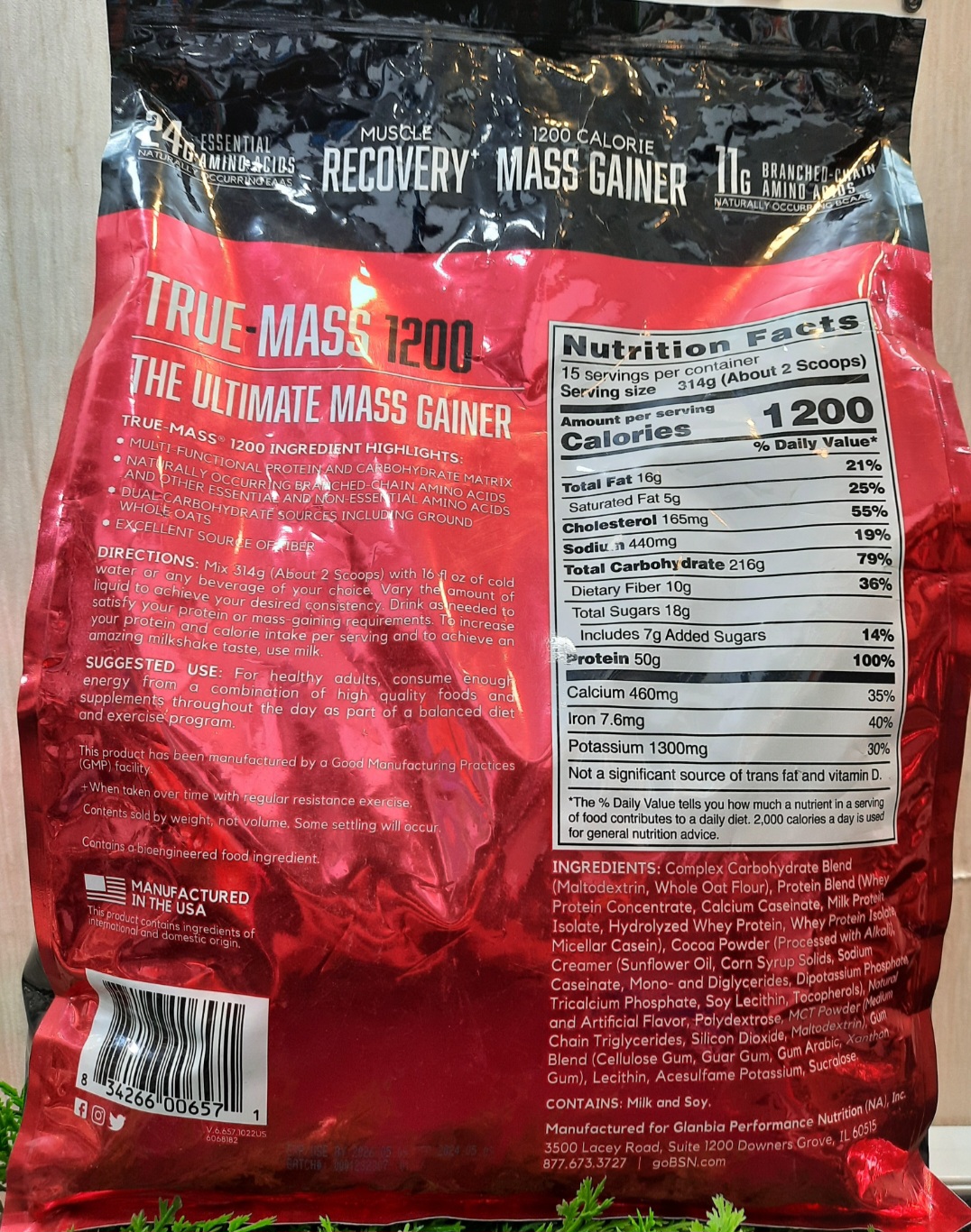 BSN True-Mass 1200: یک گینر با کالری بالا، حاوی 1230 کالری در هر وعده مصرفی است و برای افرادی که به دنبال افزایش سریع وزن و حجم عضلانی هستند، مناسب است.