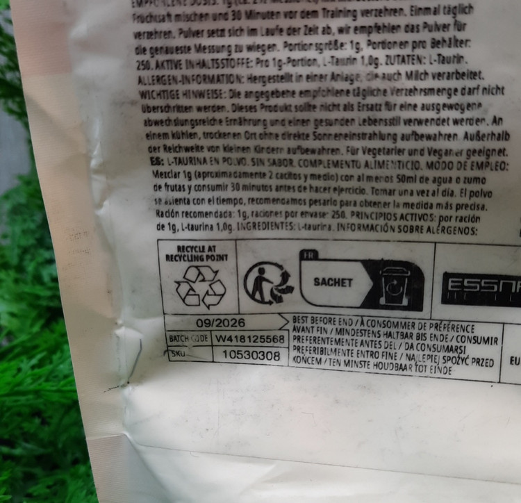تائورین خالص: 100% (معمولاً بدون طعم و رنگ)