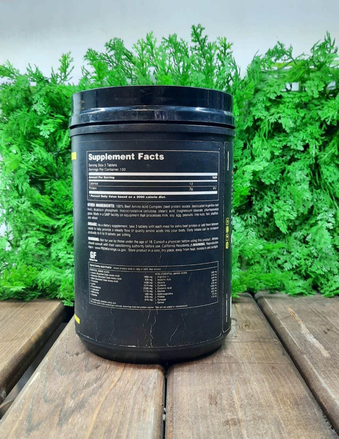 هر قرص حاوی تقریباً 1 گرم پروتئین (آمینواسید خالص)، 12 کالری، 3 گرم پروتئین در هر سروینگ (۳ قرص) .